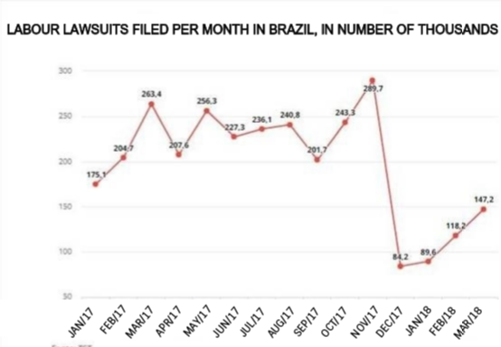 Finally, it is important to emphasize that, in spite of the legal changes, some of them are apparently contradition to the Constitution, and the Superior Labour Court has not pacified its application yet. However, one of the main purposes of the labour reform has already been accomplished, as the labour lawsuiting has significantly been reduced, according to research done by the Superior Labour Court in May of 2018:
