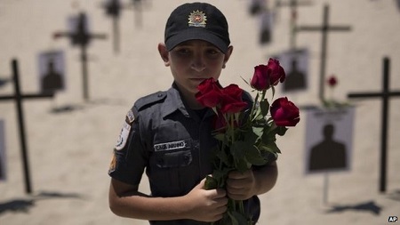 The protest took place on Copacabana beach, one of the main tourist destinations in the city, where marchers planted 80 crosses with photographs of the officers killed both in the line of duty and off duty.
