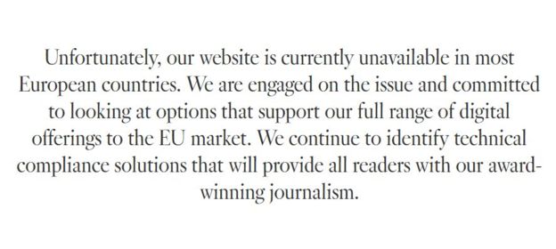 It reads: "Unfortunately, our website is currently unavailable in most European countries. We are engaged on the issue and committed to looking at options that support our full range of digital offerings to the EU market."