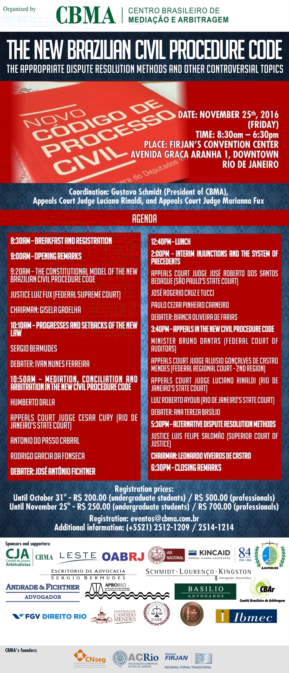 On October 25, CBMA - Centro Brasileiro de Mediação e Arbitragem will hold a seminar "The New Brazilian Civil Procedure Code – The appropriate dispute resolution methods and other controversial topics", at the Firjan's Convention Center, in Rio de Janeiro. Special guests justices Luiz Fux, of the Federal Supreme Court, and Luis Felipe Salomão, of the Superior Court of Justice, and minister Bruno Dantas, of the Federal Court of Auditors will be speaking. (Click here)